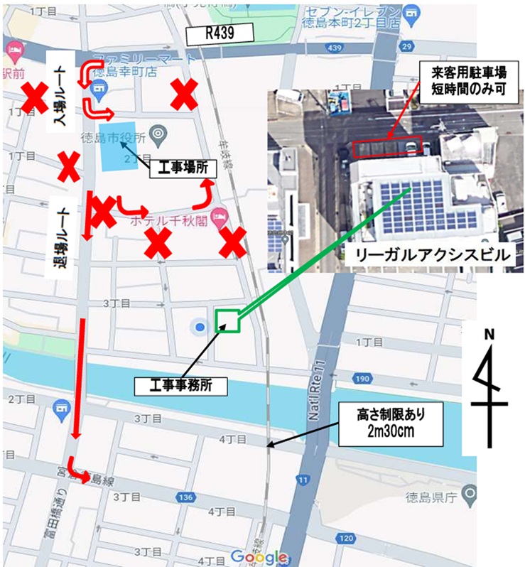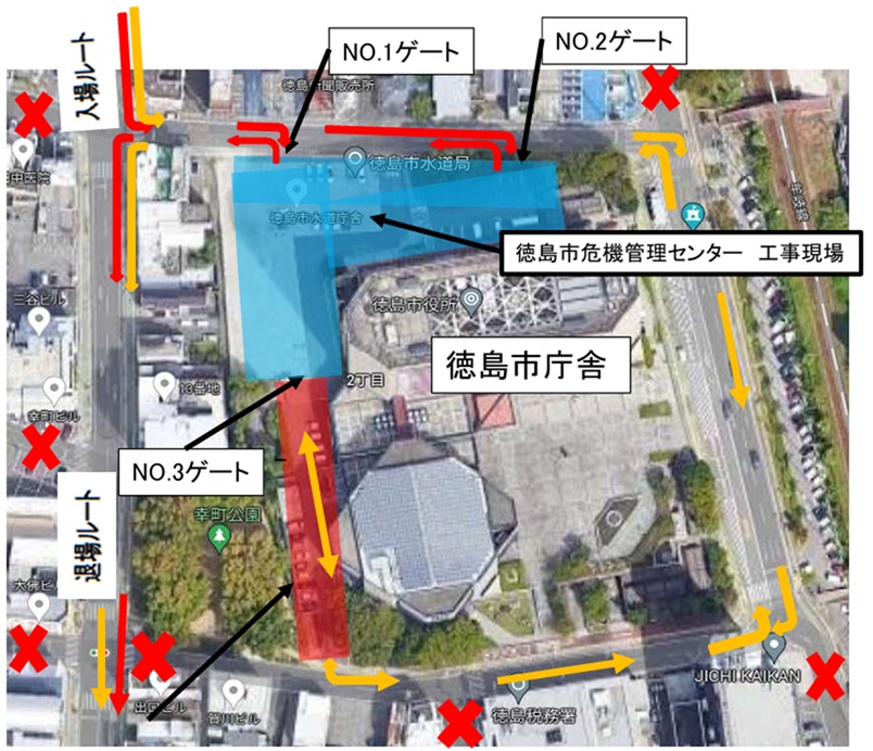 徳島市役所敷地周囲の道路を工事車両が通行する可能性があり、徳島市役所西側の道路が主な入退場ルートとなります。